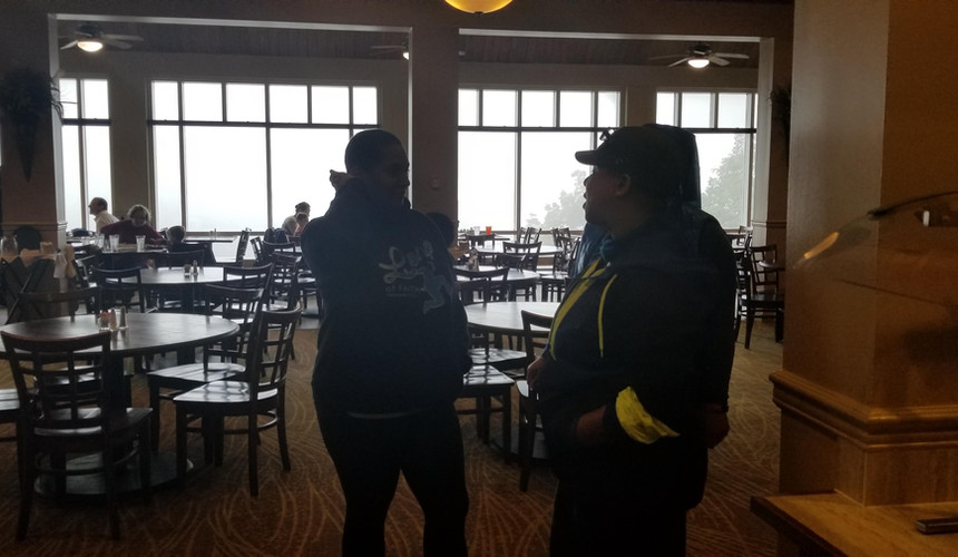 By the time we got to the falls, visibility was poor. We had increased elevation during the drive, and the fog had wrapped itself around the mountain, and made it difficult to see. Of course that did not stop us. It was misting, and cold; however, we kept on keeping on. We had driven for miles, we were on a mission, and I literally heard McFadden & Whitehead's song in my head..........